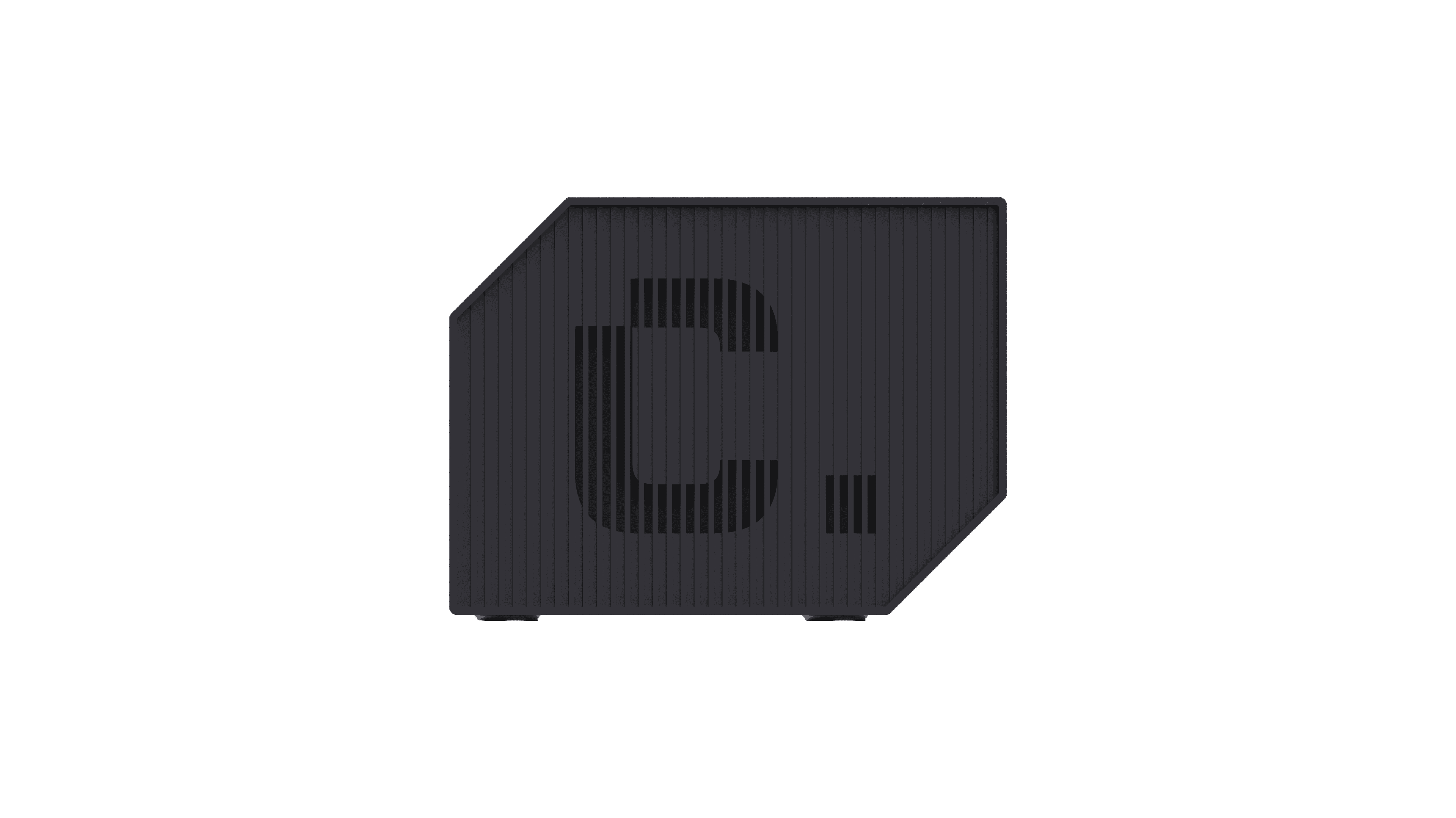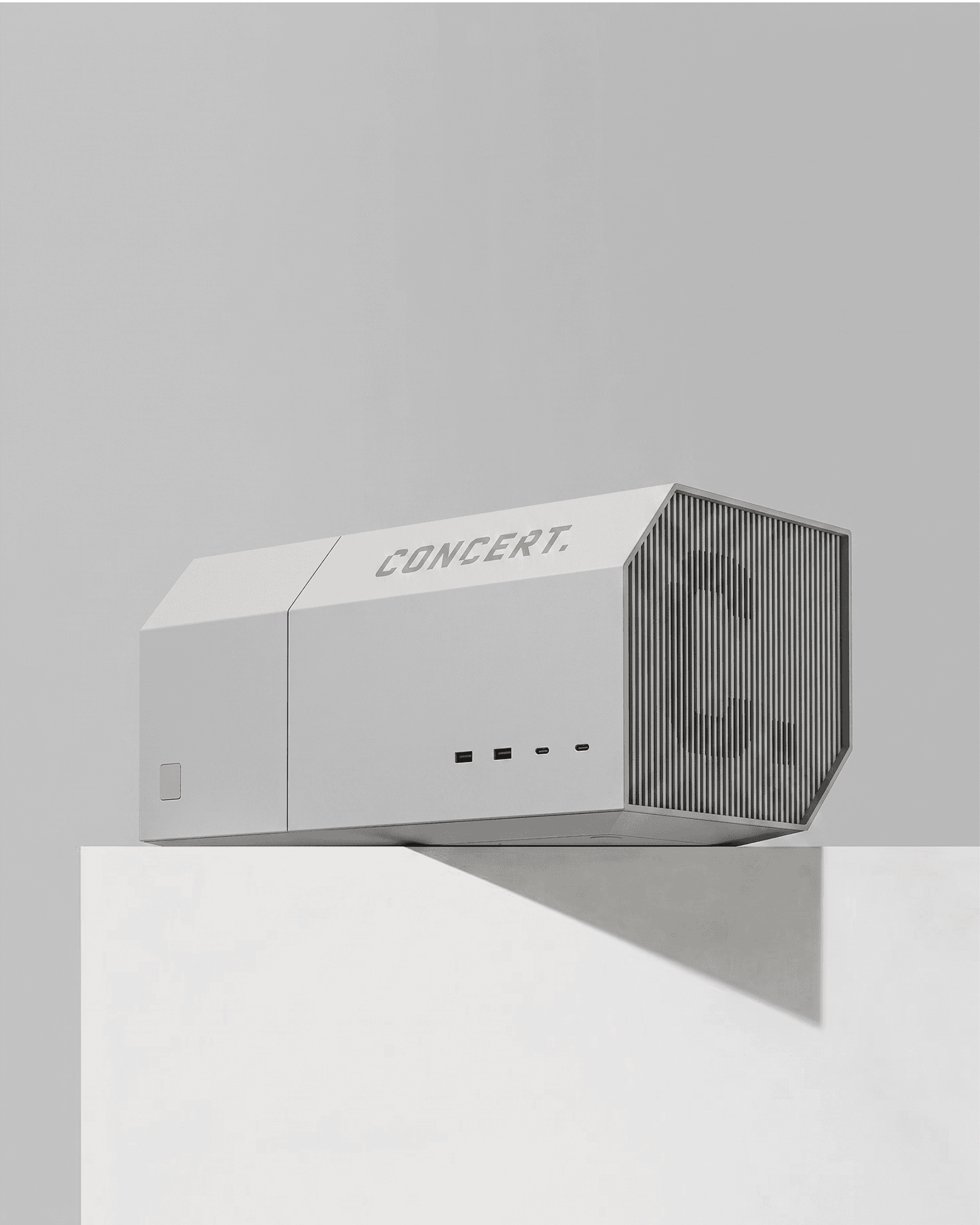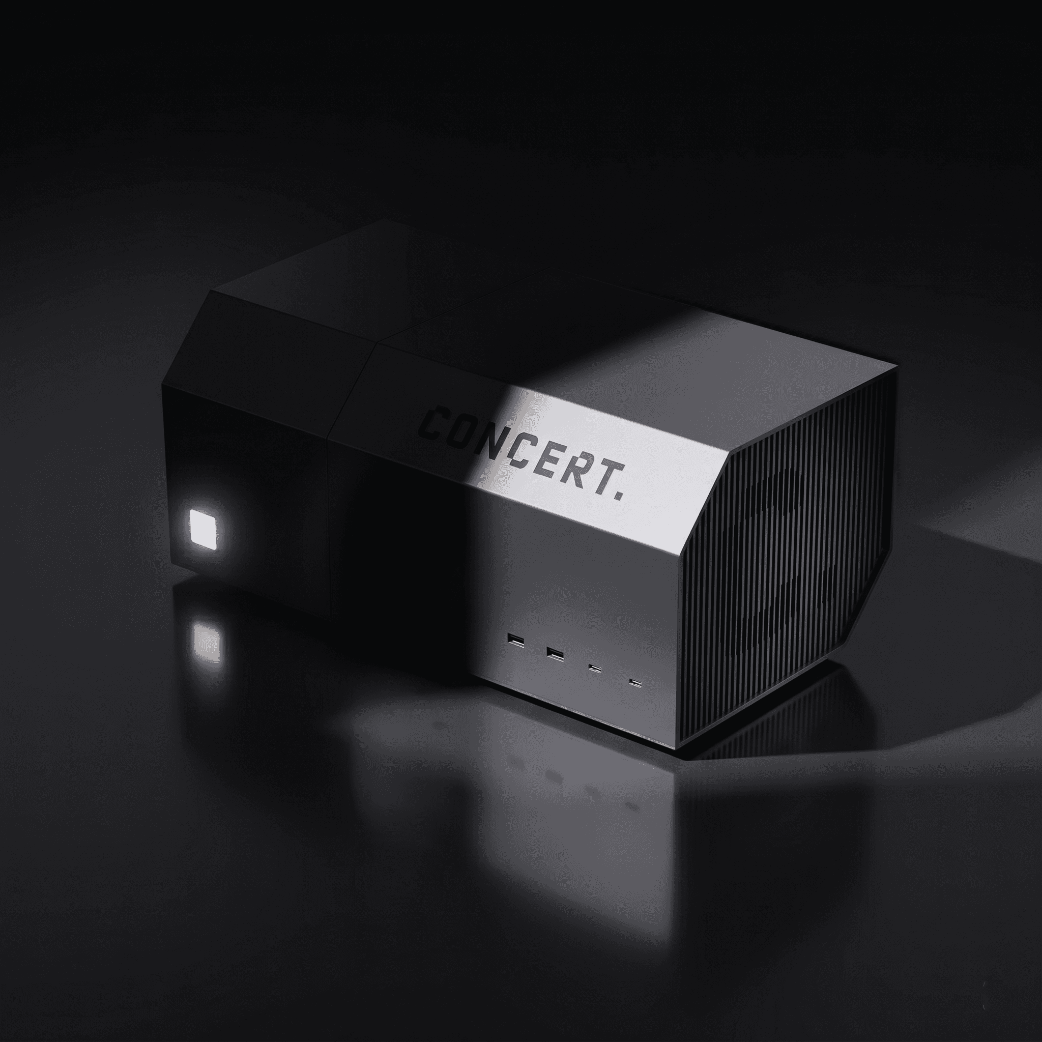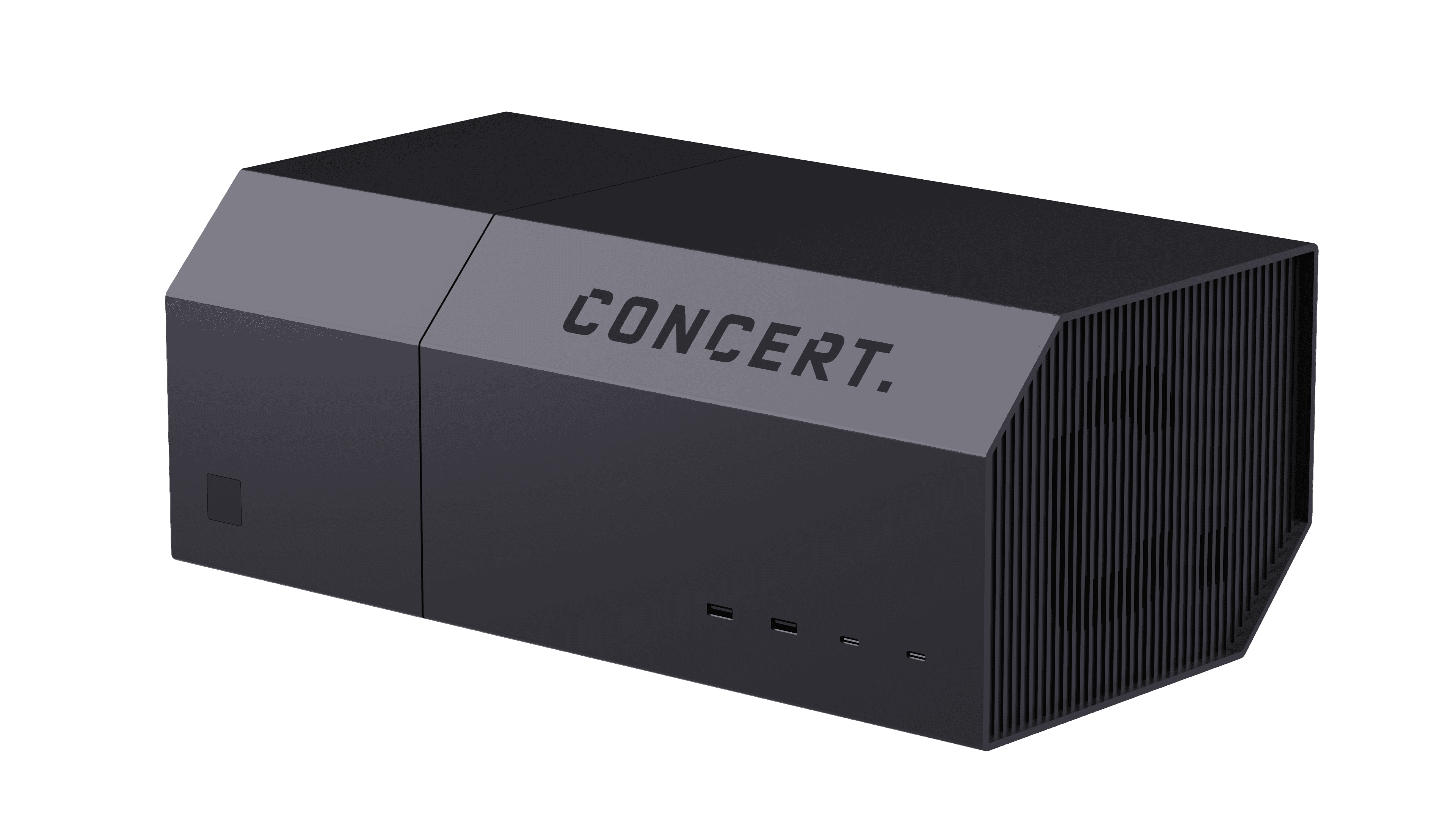 An ultra-modern, rugged edge AI PC enclosure designed for a UK based startup. The design language embodies physical AI through a bold, architectural form, balancing durability with a refined, contemporary aesthetic for demanding environments.