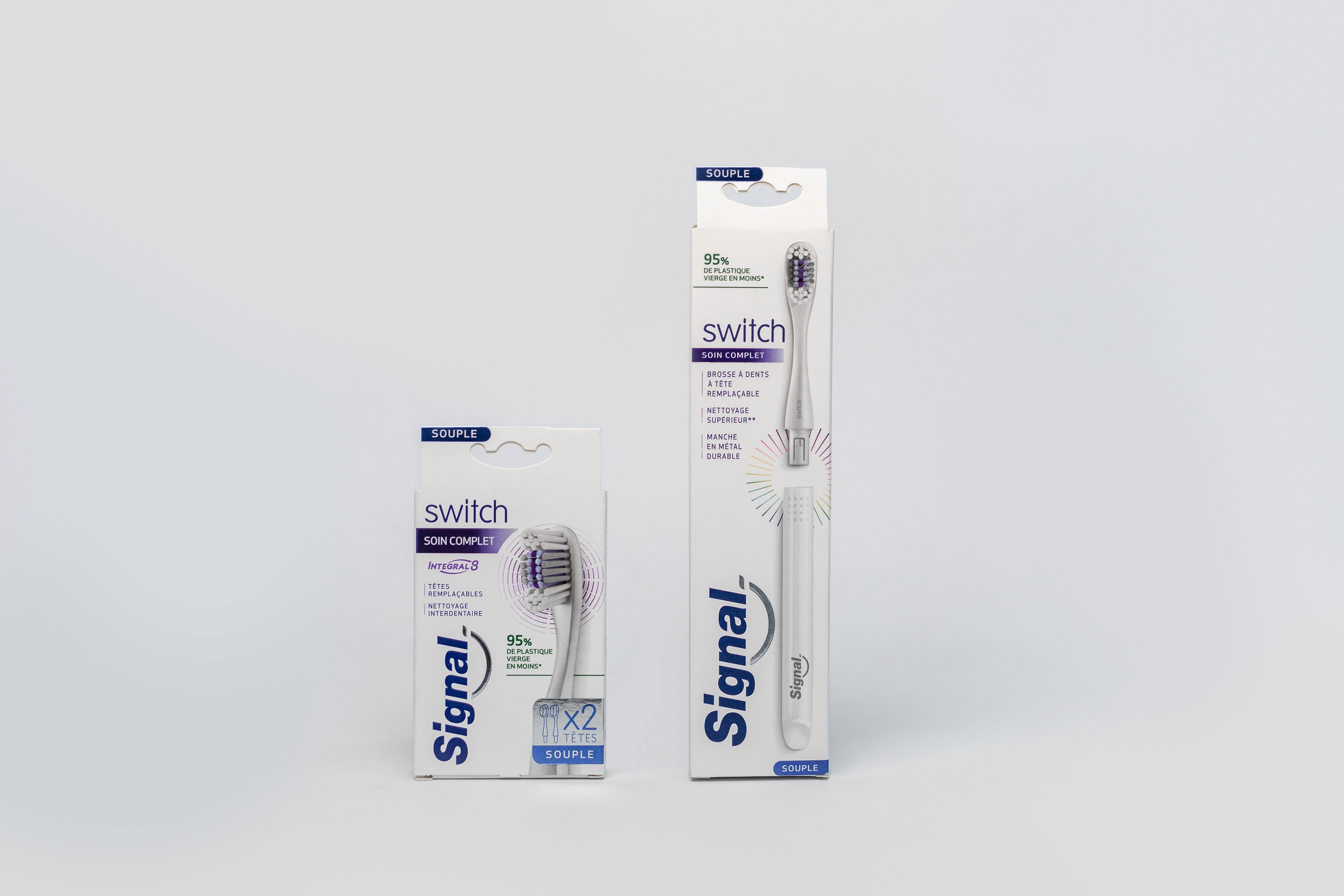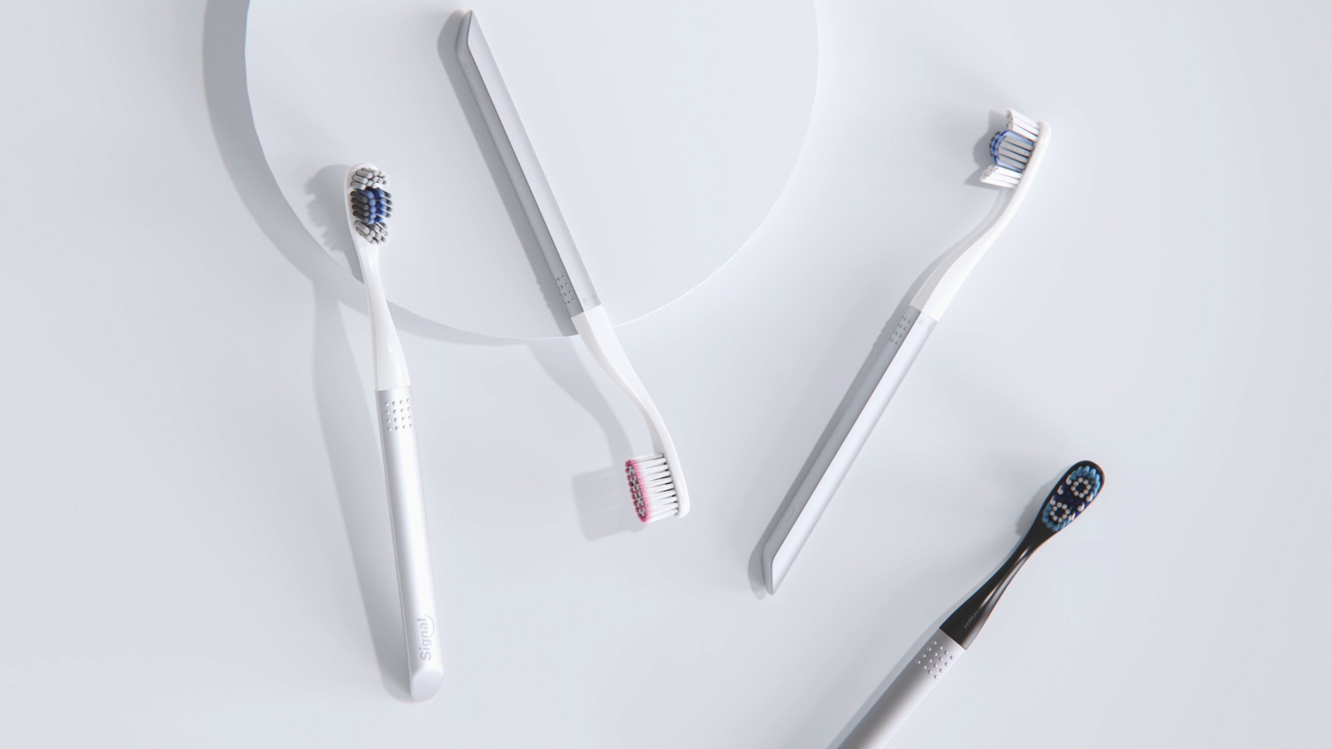 A manual toothbrush defined by a modular, user-friendly design that prioritises sustainability without compromising performance. Featuring a replaceable brush-head system, a long-lasting metal handle, and an intuitive twist-to-replace interaction, Switch offers a range of interchangeable heads to suit different user needs. Made using recycled materials and designed for mass production, it represents a step change in sustainable oral care while maintaining the clinical efficacy of the Signal brand.